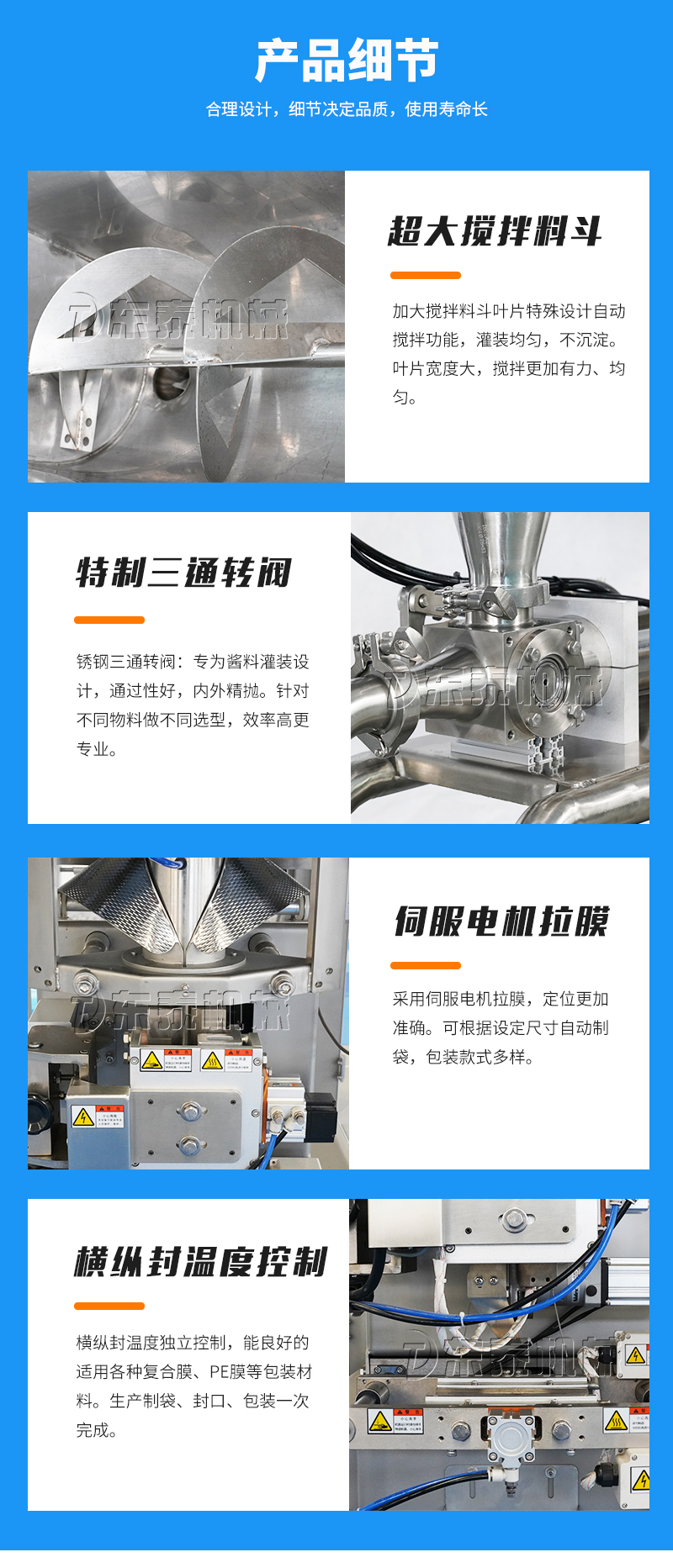 牛肉醬灌裝包裝機(jī)械主要用于調(diào)味品醬料的自動化包裝,機(jī)器安裝有橫向螺帶式攪拌,使油醬混合均勻,確保灌裝精度和產(chǎn)品包裝成品的均勻性。灌裝計量設(shè)備安裝有萬向輪,管路鏈接均采用快拆接頭,方便灌裝機(jī)拆卸移動清洗。包裝設(shè)備采用全伺服驅(qū)動器,包裝速度快,運行穩(wěn)定。